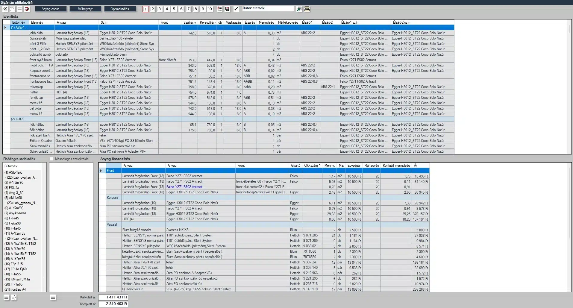 Csak módosítod pl. a front színét és a rendszer automatikusan újra generál: Az ügyfelednek árajánlatot, neked pedig: Anyagkiírást, műhelyrajzot, furatkiosztást, és optimalizálja a táblák kiosztását.