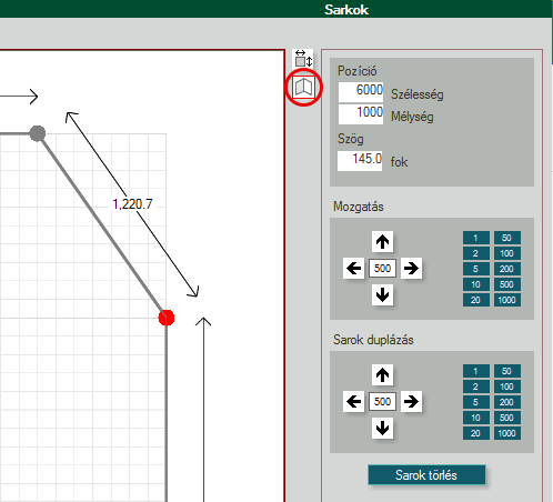 - A sarok törlés gombbal törölhetjük ki a kijelölt sarkot. Ilyenkor a sarok melletti két falból egy lesz. A szobában minimum 3 falnak kell lenni. Ebben az esetben a sarok törlés nem működik.