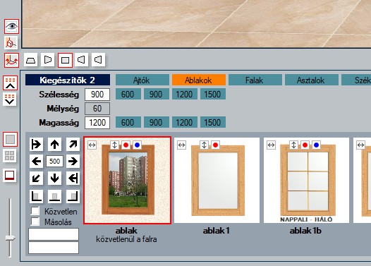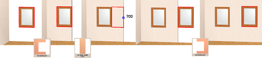 - Amennyiben több ablak kerül egy falra, akkor nem a körbe falat kell csatolni, hanem csak az egyik irányba állót, majd a másik oldalra egy faldarabot. Ennek a szélessége állítható. Utána rakjuk be a másik ablakot, és csatoljuk hozzá a falat az ellenkező irányba.