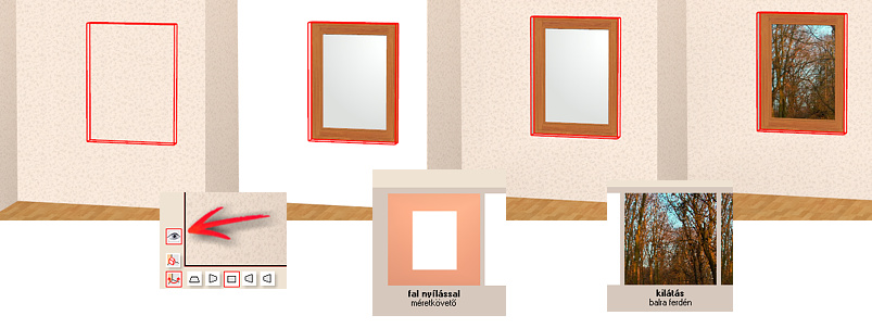 - Az ablak egy mélyedésbe kerül, mint a valóságban. Mivel így a fal mögött lesz, ahhoz, hogy láthassuk, ki kell kapcsolni a fal láthatóságát. Az ablakhoz viszont csatolható körbe fal, így már fal is van, és be is lehet majd világítani. A kilátás szintén csatolható, ami itt az ablak mögött több méterre kerülő nagyméretű kép lesz. Ha ezt kijelöljük, akkor a kiegészítő színeknél választható más kilátás is, vagy saját kép is alkalmazható.