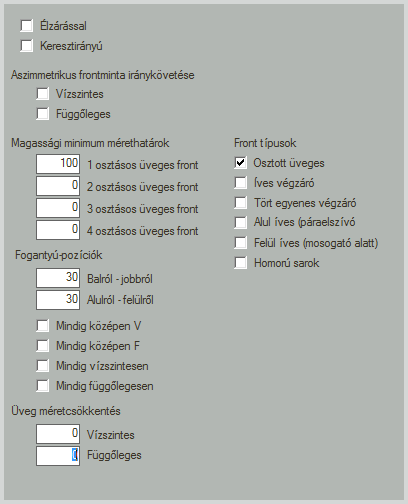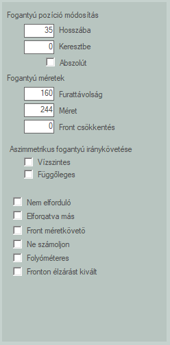 Fogantyú pozíció módosítás A fogantyú pozíciója mindig a furat helye. Két furat esetén a front széléhez közelebb eső furat. Az aktuális fronthoz rendelt fogantyú pozíciókat tudjuk itt módosítani, de nem szélességbe és magasságba, hanem hosszába és keresztbe, ami a fogantyú helyzetéből adódik. Olyan fogantyúknál van erre szükség elsősorban, ahol a hossza jóval meghaladja a furattávolságot, és így normál körülmények mellett kilógna a frontból. Az abszolút kapcsolóval a hozott, fronthoz rendelt fogantyú pozíciókat elveszítjük, és csak az itt beírt pozíciók lesznek alkalmazva.