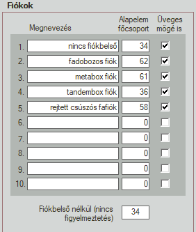 A fiókbelsőket az alapelemek között kell definiálni, mégpedig úgy, hogy minden különböző megoldásnak külön alapelem főcsoportba kell kerülnie. Minden típushoz meg kell adni a főcsoport azonosítóját. Ez az alapelemek oldalon található meg.