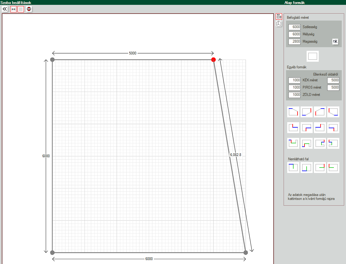 - A felső részen egy téglalap alapú alapszobát definiálhatunk. Az egyszerű téglalapot ábrázoló rajzra kattintva tudjuk a beírt értékeket aktivizálni. Ha már új falakat, sarokpontokat is létrehoztunk, vagy elmozdítottuk a helyükről, és itt a képre klikkelünk, mindig visszatérünk az alapszobához.