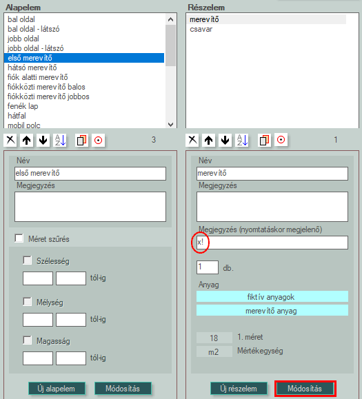 - A bevitt méretek a kész méretek lesznek! A méretmódosító értékek (élzáró vastagság, előmarás, ráhagyás) változtatásával a szabászméret dinamikusan változhat!