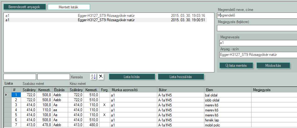 - A lista tartalmazza az elmentett elemlisták neveit, anyagukat, valamint a mentés idejét időrendbe állítva.