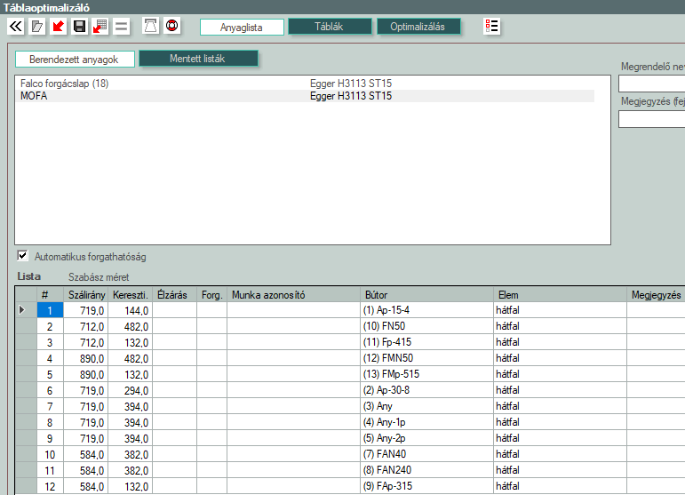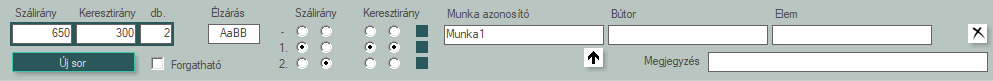 - Minimum 3 információ szükséges egy új sorhoz, szálirányú és keresztirányú méret, valamint darabszám. Ezek az új sor gomb megnyomásával kerülnek bele a táblázatba. További adatok, élzárás, név stb. szintén megadható.