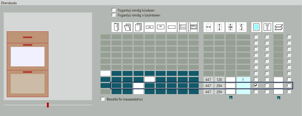 - Az ábrákkal jelölt oszlopok megfelelő mezőjére kattintva választható ki az aktuális osztás típusa. Ezek sorrendben: nyíló ajtó, bukó ajtó, kihúzós ajtó, fiók, magas fiók, vakfiók, üres és gép.