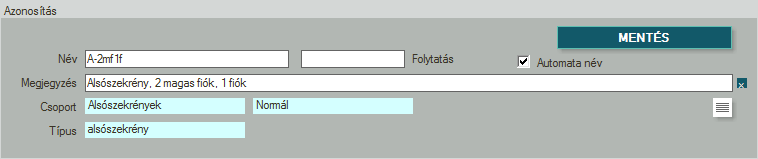 - Ha a multi be van kapcsolva (lásd lejjebb), akkor a név mögött megjelenik a folytatás mező. Ilyenkor a névhez hozzáadódnak a multi megkülönböztető karakterei, majd a folytatás mezőbe írt szöveg. Pl.: a bútor neve: bútor20xx , akkor a név mezőbe kell írni, hogy: bútor , a multi a 20, ami a szélességi megkülönböztetés. Ezeket, a különböző szélességekhez, a bútor adatbázis/főcsoportok, csoportok oldalon lehet beállítani. Majd végül az xx , amit a folytatás mezőbe kell írni. Természetesen a folytatás mezőt nem kötelező kitölteni.