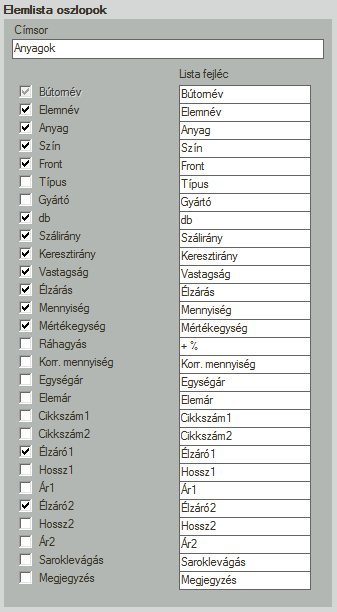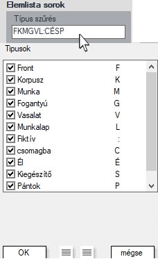 - Ha rákattintunk a típusokat tartalmazó ablak jelenik meg, ahol bejelölhető, hogy a listánkba milyen típusú anyagok kerüljenek bele. Így lehet pl. csak a vasalatokat, csak a korpuszanyagokat, vagy mindent tartalmazó listát készíteni. Minden típusnak egy-egy karakter felel meg.