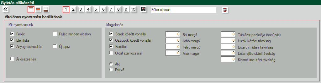 - A bal oldali kapcsolókkal lehet eldönteni, hogy mi kerüljön kinyomtatásra: fejléc / elemlista / anyag összesítés / ár összesítés. A feljécnél külön beállítható, hogy minden egyes nyomtatott oldalon megjelenjen-e, vagy csak az elsőn. Az anyagösszesítésnél beállítható, hogy mindig új lapra nyomtassa-e, vagy folyamatosan az elemlista után.
