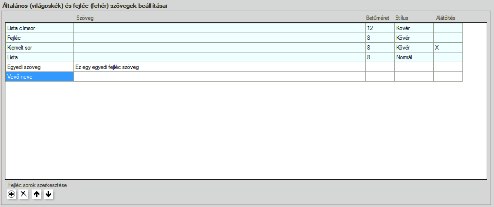 - A lista alatti ikonokkal lehet fejléc szövegek sorrendjét beállítani, vagy azokat törölni.