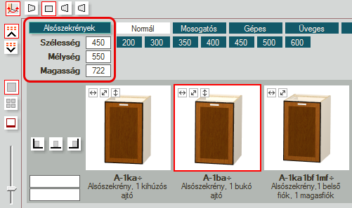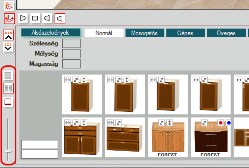 - A nézőképekre kattintva választhatunk ki egy konkrét bútort. Ezt egy piros keret jelöli. A kijelölt bútor kezdőméretei megjelennek a Szélesség, Mélység, Magasság mezőkben.