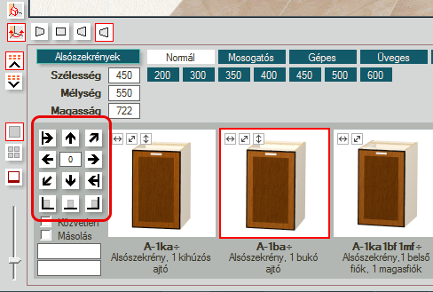 - A vonalas-nyilas ikonokkal a bútort úgy helyezhetjük be, hogy a bal ill. a jobb oldalai lesznek egy síkban, pl. egy alsó elem fölé a felsőt.