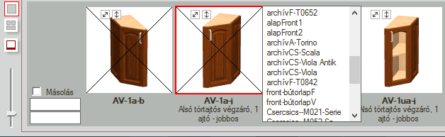 - Ha az egér jobb gombjával klikkelünk az áthúzott nézőképre, akkor megjelenik egy kis lista, ami azokat a frontokat tartalmazza, amelyekkel a bútort meg lehet jeleníteni. Ezután be kell lépni a tulajdonságok oldalra, kiválasztani a listán látható frontok közül valamelyiket. Visszalépés után már nem lesz áthúzva, és be lehet a szobába rendezni.