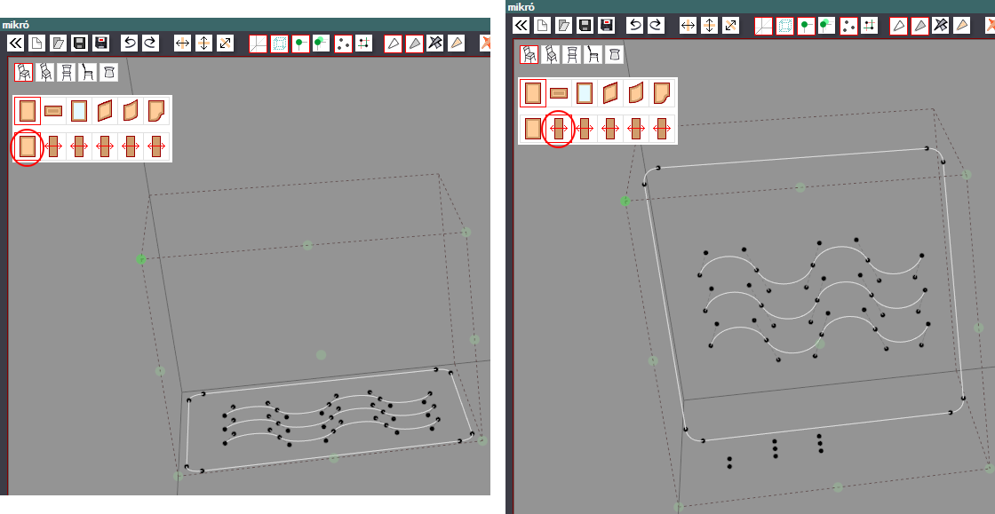 A képen a mikró felülnézeti és falnézeti rajza látható az objektumtervezőben.