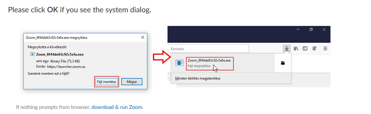 - Egy .exe kiterjesztésű fájl fog letöltődni, mentsük el, ha a böngésző rákérdez: Zoom_[vegyes karakterek].exe. Ezt a fájlt kell futtatni letöltés után.