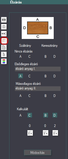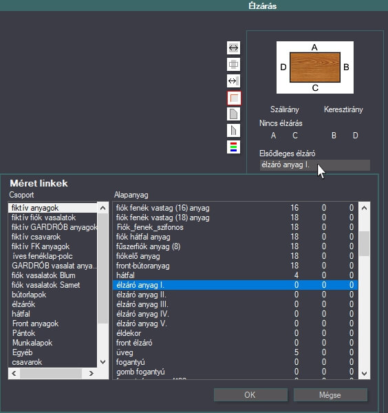 Az élzárók vastagságát és konkrét anyagát a Gyártás-előkészítő/anyag csere oldalán tudjuk kiválasztani.
