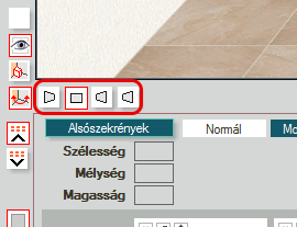 Ha az alsó ikon van bekapcsolva, akkor mindig az a fal az aktív, amelyik felé nézünk. A tér mozgatása, forgatása közben automatikusan megváltozhat az aktuális fal. A felső ikonnal mindig az éppen kijelölt elemhez tartozó fal lesz az aktív - A kijelölt fal megjelenítése ikon