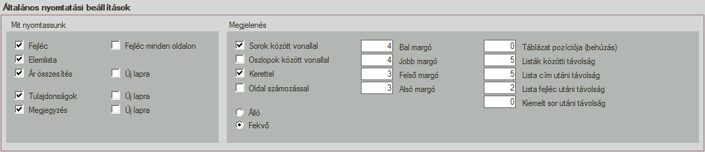 Elem- és árlista beállítások - nyomtatás, szövegek, fejléc