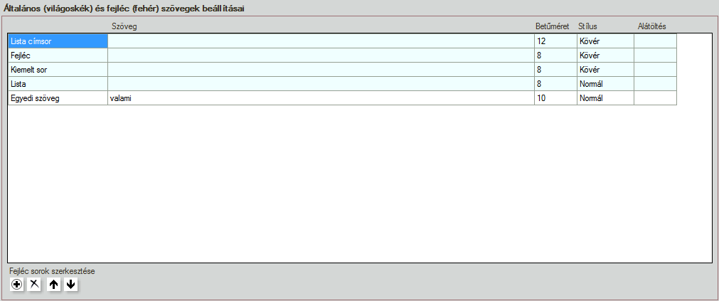 - A lista alatti ikonokkal lehet fejléc szövegek sorrendjét beállítani, vagy azokat törölni.