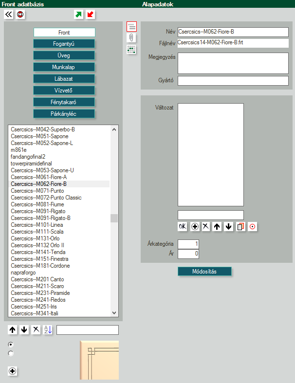 - A zöld ikonnal a kiválasztott elem adatbázis adatairól egy, az elemmel azonos nevű, .dat kiterjesztésű fájl készül, a bútorokhoz hasonlóan. Így importálásnál, - piros ikon - amikor egy másik adatbázisból szeretnénk elemet behozni a mienkbe, és ott az ki lett exportálva, vagyis elkészült a .dat fájl, akkor az adatbázis értékei is átjönnek.