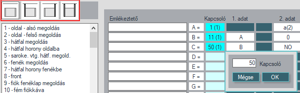 A kék mezőkön lehet a kapcsolókat megadni. Ezekre kattintva a bal oldali listán a kapcsolók közül lehet választani.