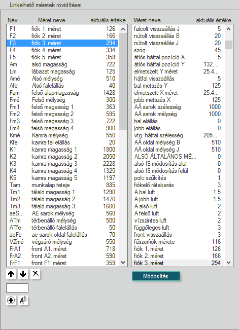 - A bal oldali listában látjuk a méret rövidítéseket a méret teljes nevével, valamint az aktuális értékével.