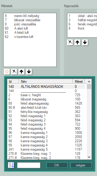 A bal listában tudjuk a bútorhoz tartozó méreteket kezelni, a két jobb oldali listában pedig a kapcsolókat