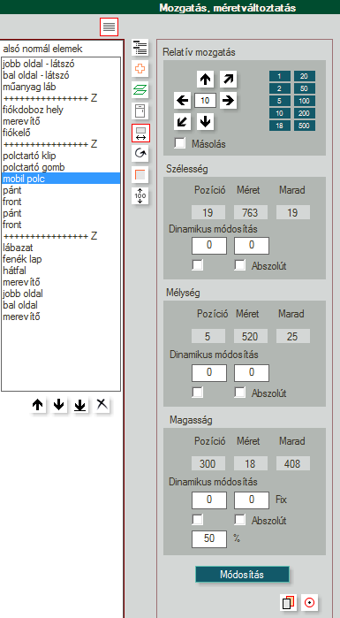 Itt lehet az alapelemeket a bútoron belül elmozdítani, illetve méretüket megváltoztatni.