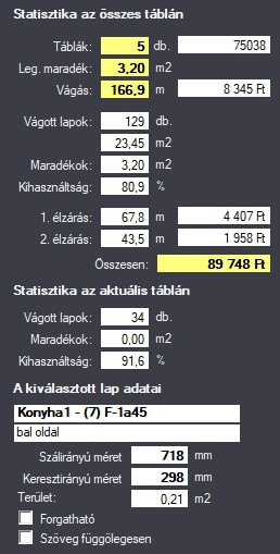 - Alatta az elkészített szabászterv statisztikai adatai olvashatók ki.