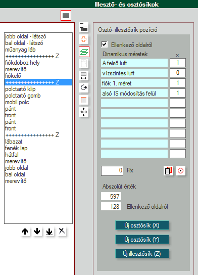 - A függőleges (Z) illesztősíkokkal a bútorok függőleges tagolását tudjuk dinamikusan megoldani. Bizonyos alapelemek (pl. frontok, polcok) méreteit, pozícióit ezen síkok határozzák meg. Lényeges az illesztősíkok és a hozzájuk igazodó alapelemek sorrendje. A kijelölt elemet a listában a fel-le ikonokkal lehet mozgatni. Pl. egy front alapelemet mindenképpen két illesztősík közé kell helyezni.
