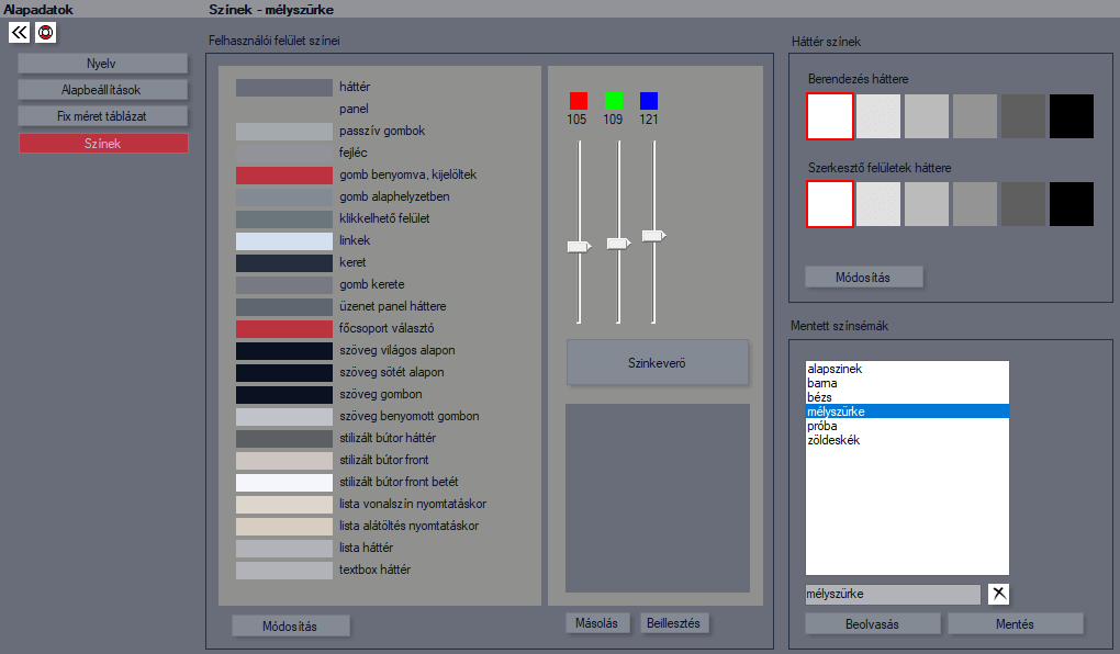 - Felhasználói felület színei: Amelyik színre rákattintunk, annak az RGB (piros, zöld, kék) összetevői jelennek meg jobb oldalt, ezen felül a Szintervező / Szín - anyagbeállítások-ban ismertetett színkeverővel tudunk egyedi színeket keverni, vagy listából választani. az adott színeket tudjuk másolni, beilleszteni másik összetevőkhöz.