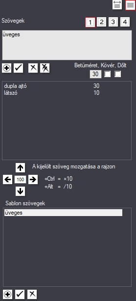 Méretezett rajzok Szövegek A gomb megnyomása után egyedi szövegeket tudunk felvinni az éppen látható méretezett rajzra. A felső Szövegek mezőbe tudjuk beírni a rajzra ráhelyezendő szöveget. A szövegdoboz alatti jobb oldali gombokkal tudjuk a szöveget testre szabni a betűméret, félkövér, dőlt opciókkal. Ezeket már meglévő szövegek módosításához is alkalmazhatjuk A szöveget a gombbal tudjuk felvinni a rajzra Miután megnyomtunk a gombot, vigyük a kurzorunkat a rajz fölé és kattintsunk oda, ahova a szöveget helyezni szeretnénk. A rajzon lévő szövegek a középső listában láthatóak. Itt ezeket ki tudjuk jelölni, az gombbal tudjuk a kijelölt szöveget törölni a gombbal tudjuk a szöveget módosítani A gombbal az összes szöveget törölni tudjuk a rajzról A lista alatti ikonokkal tudjuk a kijelölt szöveget tetszőleges értékkel mozgatni a rajzon. A Sablon szövegek listába az alatta lévő ikonnal tudjuk felvenni az éppen a felső mezőbe beírt szöveget Amikor itt kiválasztjuk a szöveget, az fennt beíródik a Szövegek mezőbe. Innen tudjuk felvinni a rajzra, mint a többi szöveget. A lista alatti és gombokkal tudjuk a sablon szöveget módosítani, illetve törölni. A gombokkal 4 különböző szöveg variációt tudunk felvinni és kiválasztani egy rajzhoz.